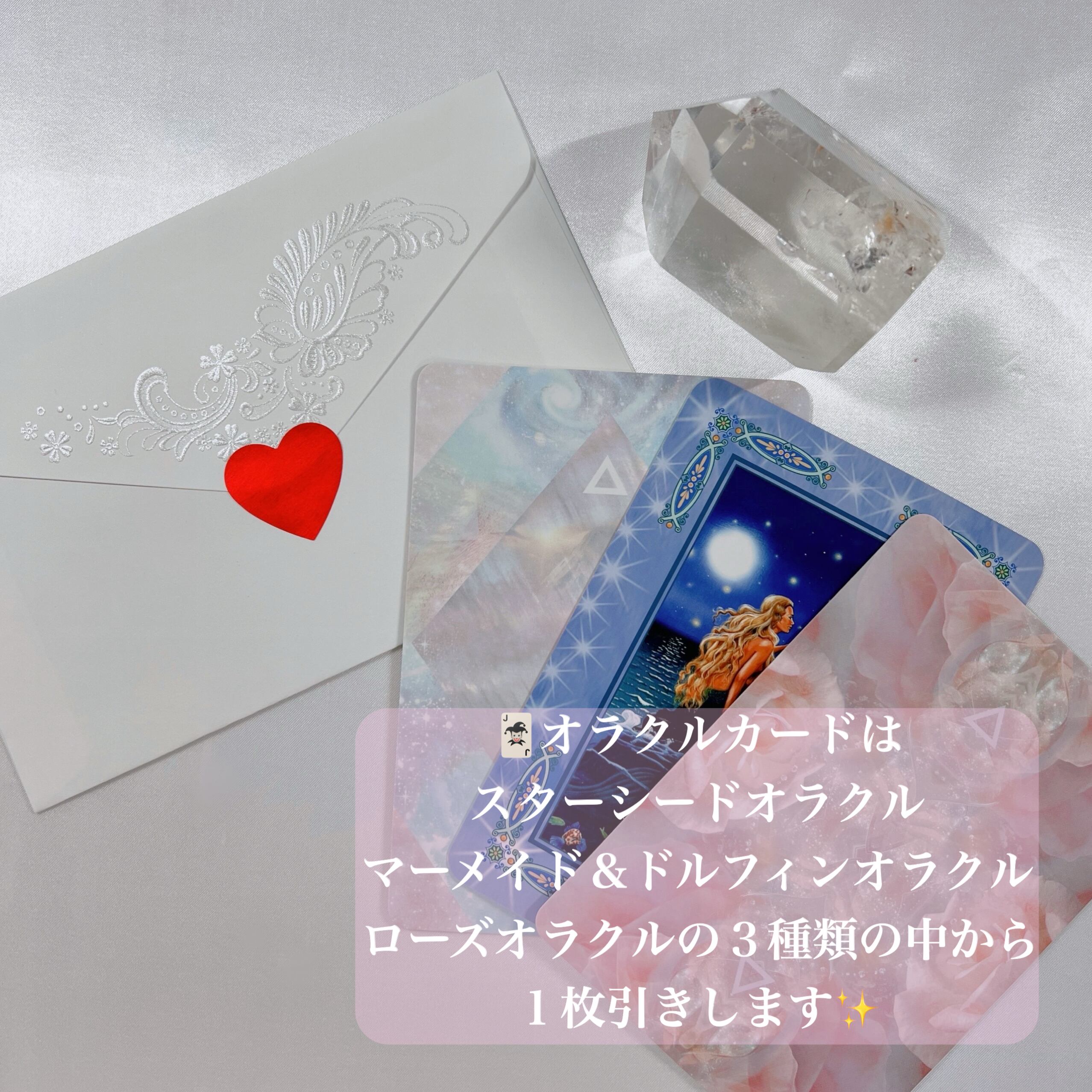 ★オラクルカードは、スターシードオラクル、マーメイド&ドルフィンオラクル、ローズオラクルの3種類の中から1枚引きします。